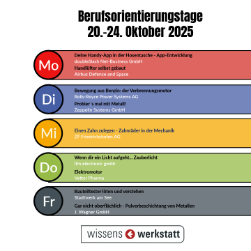 Vom 20. bis 24. Oktober 2025 von 8:30 bis 12:30 Uhr bieten wir jeden Tag bis zu zwei unterschiedlichen wiwe-Kursthemen an. Im Anschluss an jeden Kurs stellt ein thematisch passendes Unternehmen seine Ausbildungsberufe vor und beantwortet Fragen. Abschließend informieren Berufsberater der Arbeitsagentur über Bildungswege und Bewerbungsabläufe.