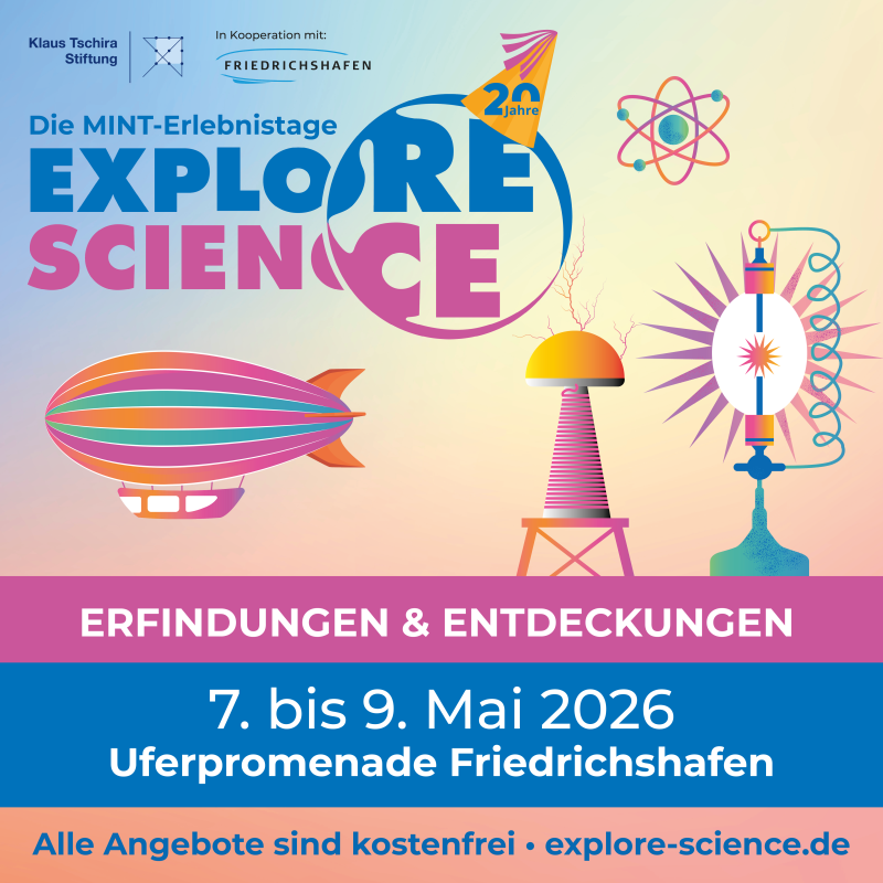 Vom 7. bis 9. Mai 2026 wird die Uferpromenade zum großen Freiluftlabor. Explore Science findet in Kooperation mit der Stadt Friedrichshafen statt. Unter dem Motto „Erfindungen & Entdeckungen“ können Kinder und Jugendliche Themen aus Mathematik, Informatik, Naturwissenschaften und Technik (MINT) hautnah erleben.